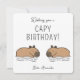Ilustração de capivaras nadando cartão de aniversário com expressão tipográfica: "Desejando um aniversário capivara!". A ilustração da capivara é uma arte digital original criada por @artbybiyan.