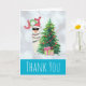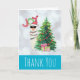 Cartão de agradecimento de Natal com uma ilustração engraçada. Uma lhama fofa vestindo óculos de sol pretos e um chapéu de Papai Noel vermelho. De pé atrás de uma árvore de Natal com presentes festivos. A palavra Alegria escrita acima de sua cabeça em uma fonte colorida de feriado. Fundo de bokeh prateado com uma borda azul gélida. Design temático de Natal caprichoso e divertido. Mensagem interna para ser personalizada.
