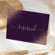 Esta elegante e moderna carta de assentos reservados para a mesa de casamento apresenta brilho sutil em cantos opostos. A palavra "reservado" aparece em um guião de escrita manual cor-de-rosa rosa com pinceladas antes e depois em fundo roxo escuro em ambos os lados da placa.