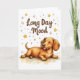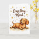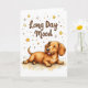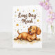 Uma ilustração bonita de um Dachshund deitado sobre a barriga com olhos fechados e língua levemente para fora, cercado por estrelas e faíscas ao estilo do rabisco. Projetado em um estilo alegre de cartão de boas-vindas com o texto engraçado: "Longo Dia de Humor". Uma carta divertida que é perfeita para amantes de Dachshund ou para qualquer um que conheça a alegria de uma boa soneca.