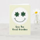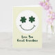 This card shows a tall, simple layout with a big smiling face near the top, like it’s beaming down at someone it cares about 💚. The face sits inside a white circle, with a curved smile that feels gentle and welcoming. Instead of regular eyes, it has two deep forest-green five-petal flower shapes that read like little shamrocks, adding a lucky, affectionate touch ☘️. Below the face, the message “Love You Great Grandma” is placed in a flowing green font that echoes the eye shapes. Everything rests on a creamy yellow background that keeps the focus on the smile and the loving words. The open space around the face and text makes the design feel calm, like a quiet moment shared between family members. The green details stand out clearly against the pale backdrop, with the white circle acting like a soft spotlight on the expression. The flowers are evenly spaced as eyes, and the green lettering sits centered beneath the circle on the warm yellow field.