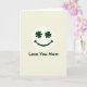This greeting card features a simple smiling face centered on a pale cream background, giving the whole scene a soft, cozy look. The face is a smooth white circle, and its “eyes” are two matching dark emerald shamrocks that seem to look out with a sweet, affectionate gaze 💚. A thick curved smile in the same green sits below, like a gentle grin meant just for Mom. Under the face, the words “Love You Mom” appear centered near the bottom in a rounded sans-serif font. The text is also dark emerald green, tying it neatly to the shamrock eyes and the smile ☘️. With only cream, white, and deep green, the design stays calm and uncluttered while still feeling close and caring. The shamrocks are evenly spaced as the eyes, and the green smile arcs smoothly beneath them.