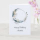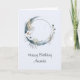 Cartão de aniversário com ilustração mística. Uma lua azul escura com um contorno fino elegante e flores brancas ao longo das suas bordas.