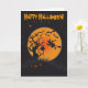 O fundo preto com a árvore inoperante, sentando-se na árvore é uma coruja assustador! Sob a árvore são as abóboras do Dia das Bruxas! Um vôo da bruxa em seu broomstick destaca este cartão assustador que é grande para um convite de festas do Dia das Bruxas! O texto feliz do Dia das Bruxas pode ser editado! O texto ou as fotografias podem ser adicionados ao interior do cartão! Escolha o porte postal acima de harmonização!