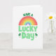 This card features a simple white background with a centered layout that feels friendly and upbeat 💚. At the top, “HAVE A” appears in a darker emerald green and curves gently, like it’s leaning in toward what comes next. Tucked right beneath that arc is a rainbow 🌈, stretching from red and orange through yellow, green, blue, and purple, like a bright bridge connecting the words above and below. Under the rainbow, “LUCKY DAY” sits in a lighter spring green, giving the message a softer, more welcoming look. Two small shamrocks in matching bright green sit on either side of “DAY,” like little companions framing the line and adding a quiet, close-knit touch ☘️. The flat shapes and crisp edges keep everything modern and uncluttered, with the greens and rainbow doing all the talking. The text is stacked in the center, with the curved top line, the rainbow band, and the straight “LUCKY DAY” line aligned neatly on the page. The shamrocks are evenly spaced beside “DAY,” and the rainbow’s arc mirrors the curve of “HAVE A” above it.