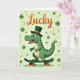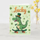 This card shows a cheerful green dinosaur rolling along on a dark green skateboard, its wide eyes and toothy grin turned outward like it’s inviting a friend to join the fun 💚. It wears a tall leprechaun-style top hat in deep emerald with a bright orange band, matching the orange wheels beneath its feet. Soft blush marks on its cheeks and a tiny hint of red in its smile add a sweet, friendly warmth to the character. The dinosaur fills the lower half of the design in layered shades of green, steady and confident as it balances on the board. Behind it, a light lime-green background sets an easy, sunny tone, sprinkled with darker shamrocks and curling golden ribbons that loop through the space ☘️. Near the top, the word “Lucky” sits centered in large gradient orange lettering, standing out clearly against the pale green. The shamrocks cluster in different sizes around the dinosaur while the golden ribbons sweep diagonally across the background.