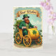 This St. Patrick's Day card shows a jolly, ruddy-bearded man in a forest-green suit and matching top hat, looking off to the right with a small, friendly smile that feels like it’s meant for someone close 💚. He sits snugly inside a shiny golden, barrel-shaped cart that resembles a pot of gold turned into a little ride, with sturdy wooden wheels beneath it. A bright four-leaf clover is displayed on the side of the cart, like a lucky badge he’s proudly showing to a friend ☘️. The lighting is bright and even, making the greens and golds stand out against the calm scene. Behind him, an azure sky holds soft, painterly clouds above patches of deep green shamrock-filled foliage that curl into the edges of the picture. Near the top, a golden banner stretches across with the words “Best Wishes” written in a flowing style, the letters set in a darker tone for contrast. The golden cart has a smooth shine, the wheels show warm wood grain, and the clover emblem sits centered on the cart’s side.