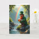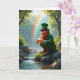 This St. Patrick's Day card shows a classic leprechaun in an emerald green suit and tall top hat with a gold buckle, his fiery orange beard standing out against the sea of greens 💚. He squats beside a clear, gently moving stream, holding a warm mug of golden ale close to his chest as if savoring a quiet pause. Around him, dewy grass and leafy trees frame the water, and the light falls softly like a private moment shared with a close friend. A wide rainbow 🌈 curves across the hazy background, tinting the scene with gentle bands of color above the treetops. The leprechaun’s calm, thoughtful gaze and relaxed posture give the setting a tender, companionable feel, as though he’s waiting for someone to join him by the bank. The greeting “Happy St. Patrick’s Day” sits along the top in light gold lettering, standing out neatly against the darker green sky. Small highlights catch on his boots, the smooth stones in the stream, and the steam rising from the mug near the lower right edge.