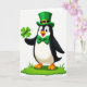 On the front of the card, a cartoon-style penguin stands centered on a small patch of green grass against a white background, dressed for St. Patrick’s Day with an emerald top hat and a gold buckle. A matching green bow tie sits under its beak, and its black-and-white feathers are accented by an orange beak and feet. The penguin’s wide smile, bright eyes, and rosy cheeks give it a friendly, slightly flirty look, like it’s sharing a lucky find with someone special 💚. One wing lifts a four-leaf clover up and forward, as if offering it to a close friend or sweetheart ☘️. Across the clover, the word “Luck!” appears in dark lettering, centered on the leaves and easy to spot. The hat has a shiny highlight and soft shading, while the clover’s leaves are shaped like small hearts. The scene stays simple and focused, with the penguin upright in the middle and the green grass forming a small base beneath its feet.