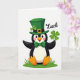 This card shows an adorable penguin centered on a white background, dressed up for St. Patrick’s Day with an emerald top hat featuring a gold buckle and a small shamrock ☘️. A matching green bow tie sits neatly at its neck, giving it a dressed-up look that feels like it’s ready for a sweet photo with a close friend 💚. The penguin’s black-and-white feathers contrast with its orange beak and webbed feet, and its wide eyes and faint rosy cheeks add a tender, affectionate expression. In one flipper, it holds a four-leaf clover as if offering it to someone special. The word “Luck” appears near the hat in green lettering, floating slightly above and to the side so it frames the face without covering it. A small patch of green grass rests under its feet, grounding the scene while keeping the background mostly open and bright. The hat’s shamrock detail, the clover in its flipper, and the little grassy base are the main green accents against the white space.