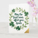 This greeting card features a friendly blessing, “May the frost never afflict your Spuds,” written large in dark emerald green across the center on a white background 💚. The lettering curves smoothly, giving the line a warm, teasing tone that feels like something shared between close friends. Around the words sits a circular wreath of twisting vines and small leaves, layered in many greens from deep forest to light spring tones. Tucked into the wreath are four shamrocks in a solid, darker green, evenly spaced like little lucky accents ☘️. The text stays centered while the greenery frames it closely, as if leaning in to spotlight the message. The open white space keeps the design airy, making the greens stand out without crowding the page. In the bottom-right corner, a narrow sliver of golden ribbon peeks in at an angle, adding a small warm highlight against the white.