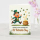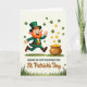 This card shows a cheerful leprechaun with a fiery orange beard and rosy cheeks striding in from the left, his grin aimed toward the treasure like he’s sharing a private joke with a friend 💚. He wears a deep emerald top hat and matching suit with green shoes, set off by a golden waistcoat and belt that catch the light. On the right, a pot brims with gold coins, and several coins hang in midair as they tumble down, adding a lively sense of motion ☘️. The background is a soft light cream, sprinkled with small dark green four-leaf clovers that feel like little winks across the page. Along the bottom, a narrow band of green grass grounds the scene and frames the characters like a simple stage. The message “WISHING YOU A POT OF HAPPINESS THIS St. Patrick’s Day” is placed prominently across the upper area in dark green lettering, easy to spot against the pale backdrop. The leprechaun’s gaze and forward step lead straight to the pot, as if he’s proudly offering the lucky find to someone close. A few bright coins glint above the pot while clovers dot the cream space behind them.