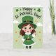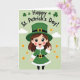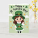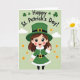 This design shows a stylized young girl at the center, with wide sparkling eyes and a rosy-cheeked smile that feels like it’s meant just for you 💚. She’s dressed in deep emerald green, wearing a leprechaun hat with a shiny gold buckle and a matching dress trimmed with soft white fluff at the collar, cuffs, and hem. The pastel green background keeps the scene light and cozy, like a gentle glow around her. Her slightly raised hand reaches forward in a friendly, almost affectionate greeting, as if she’s sharing the moment with someone close. Near the top, the phrase “Happy St. Patrick’s Day!” arches overhead in dark lettering, with small shamrocks sprinkled around it ☘️. Golden coins marked with dollar signs tumble through the space around her, adding a lucky, storybook touch. A few shamrocks float near the headline while the coins glint against the soft green backdrop.