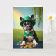 This design shows a Boston Terrier centered on the front, staring straight out with a calm, slightly pleading look that feels like it’s asking you to come closer. It wears an emerald-green top hat with a small shamrock and a matching green bow tie, setting a sweet St. Patrick’s Day mood 💚. Its black-and-white coat stands out against the bright green accessories, and the fine whiskers and glossy nose are picked out by soft, diffused light. At the bottom, its paws rest on a deep indigo surface where scattered gold coins glint like little gifts left for someone special. Behind the dog, a green field fades into a pale blue sky, and a soft rainbow curves across the distance 🌈. A thin sprig of green leaves hangs from the upper right corner, like a gentle frame leaning in toward the dog. The greeting text sits near the top in light green lettering, spaced to float above the hat without covering it. The background shows a grassy green-to-sky-blue gradient with a faint rainbow arc and a small leafy branch in the upper right.