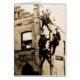 Homens posando para uma foto em um poste telefônico na frente de algumas admiradoras.