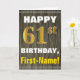 Este simples design de cartão de saudação com tema de aniversário apresenta um desejo de aniversário quente como "HAPPY 61ruas BIRTHDAY, First-Name!" na frente, em texto em negrito sobre um fundo de padrão de aparência de madeira falsa. O número de aniversário tem uma aparência falsa e imitada de cor dourada. O nome na frente pode ser personalizado. O dentro apresenta uma mensagem de aniversário personalizável. Um cartão de boas-vindas como este poderia ser uma maneira divertida de fazer votos de aniversário a alguém que comemora o seu sessenta aniversário. [~Z0000280]