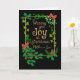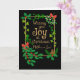 Um cartão de natal de na moda para a sogra, com folhagem tradicional de Natal, sagrado e conterrâneo amarrado com arcos vermelhos, prigos de feno e de abetos e um cone de abetos, tudo num fundo negro. A saudação do cobrir de frente em letras decorativas douradas é: 'Desejando sua Alegria no Natal' e 'Madre-em-Lei!' em uma letra informal de escrita manual. A mensagem dentro é apenas uma sugestão e você pode personalizá-la facilmente para atender às suas necessidades ou excluí-la completamente se preferir um cartão 'Dentro de Vazio'.