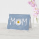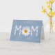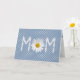 Dia de as mães para mãe com texto margarida em pétalas de flores em bolinhas branca e fundo azul.