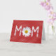 Dia de as mães para mãe com texto margarida em pétalas de flores em bolinhas branca e fundo colado vermelho.