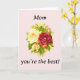 Celebre sua maravilhosa mãe com este cartão do Dia das Mães, lindamente desenhado. Com um elegante buquê de rosas e a mensagem sincera "Mãe, você é a melhor!", este cartão captura perfeitamente a sua gratidão e amor. A ilustração floral clássica adiciona um charme atemporal, tornando-o adequado para qualquer estilo. Ideal para presentear junto com flores ou como uma surpresa por si só, é uma maneira adorável de fazer com que sua mãe se sinta querida e especial. Impresso em papel de alta qualidade, este cartão foi projetado para deixar uma impressão duradoura. Perfeito para o Dia das Mães, aniversários ou simplesmente porque sim!