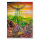 Pintura acrílica colorida e vibrante em verde, amarelo alaranjado, roxo, castanho vermelho, cores brancas de 2009, Duelo entre Bradamant e Negromcer em seu grifão com asas enormes. Orlando Furioso, Canto 2 escrito pelo poeta Renascentista italiano Ludovico Ariosto 1516 .