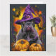 Abraçar o espírito do Dia das Bruxas com esta design encantadora que apresenta um cachorro fofo num chapéu de bruxa rodeado por abóboras entalhadas. Perfeito por adicionar um pouco de charme assustador às suas comemorações festivas.