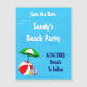 Um cartão magnético personalizado de Salvar a Data com arte divertida de praia ou piscina com bola de praia vermelha e branca, guarda-sol verde, sandálias de férias e óleo bronzeador em um fundo azul aquático com ondas encaracoladas.
