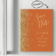 A borda esquerda deste elegante cartão magnético de salvar a data de casamento apresenta uma borda dourada com brilho falso. O texto personalizável combina escrita à mão em cor dourada pálida, fontes copperplate e itálico em um fundo laranja queimado.