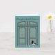 Ilustração de portas clássicas de madeira de turquesa francesa e desenho do estilo de desenho retrô de pássaro pinto preto e branco com texto 'Parabéns. Perfeito para uma nova casa, um novo começo ou aventura