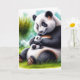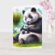 Mamãe panda ursinha berrando um panda bebê em um prado verde, com bambu suavemente balançando ao fundo. Todo o texto pode ser alterado.