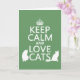 Este é o clássico poster de guerra "Manter Calmo e Continuar", reformulado para "Manter os Gatos Calmos e de Amor". Está escrito em branco sobre fundo colorido, e é acompanhado por silhuetas de gatos sentados perto das palavras. Disponíveis em uma grande variedade de produtos, incluindo cadernos de anotações, adesivos, botões, bolsas de livros e t-shirts, eles fazem presentes/presentes/guloseimas de excelentes para amantes e donos de gatos, ou obrigados que você oferece para veteranos e donos de lojas. Todas as cores de fundo são facilmente personalizadas para suas preferências.