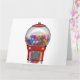 Uma máquina de distribuição de gumball vermelha vintage cheia de gumballs multicoloridos num fundo branco isolado