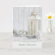 Lanterna branca brilhante e ornamentos prateados na neve para o Natal. A imagem tem um efeito de borda rasgada.
