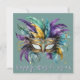 Feliz cartão de saudação Mardi Gras com uma máscara de mascarada ouro, verde e roxo, enfeitada com joias. O reverso deste cartão de saudação Mardi Gras é personalizável com espaço para seus desejos de Mardi Gras e sua assinatura.