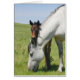 Fotografia de uma cinza está pastando com um potro de baía ao lado dela, preso no pescoço.