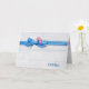 Margarida rosa em fita de bolinhas azul e branca sobre fundo de madeira branca para obrigado