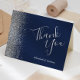 Este elegante cartões de agradecimentos de casamento moderno apresenta uma borda de cintilação de prata em um fundo azul marinho. O texto personalizável combina as palavras "Obrigado" no guião da cinza prateada e os nomes da noiva e do noivo em itálico.