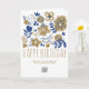 Cartão de Saudação Feliz de Aniversário para empresas limpas e na moda, fantástico e branco, com uma ilustração do estilo de rabisco original de flores diferentes de cor azul-marinho e dourada num fundo branco. Note-se que o ouro nesta design é um impressão de cor bege castanho plano e não é uma folha metálica dourada. Altere a imagem "seu logotipo aqui" com seu logotipo ou remova-a se quiser usá-la sem um logotipo. Não se esqueça de personalizar o texto frontal e dentro deste design floral também.