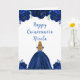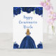 Este cartão de aniversário da Quinceanera apresenta flores florais azuis, azuis e brilhantes marinhos, e uma bela princesa com cabelos loiros e um vestido elegante. Isto é perfeito para uma festa de aniversário de Quinceanera.