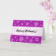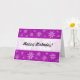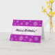 Um cartão com mármore roxo abstrato como textura com motivos florais. Feliz aniversário na frente, em uma banda branca de efeito sobreposto e na dentro. NB Todo o texto deste cartão é personalizável, pelo que também poderia ser adaptado para outras ocasiões.