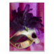 Cartão com uma foto de uma máscara roxa do mascarada com penas e brilho.