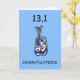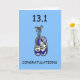 Um par de calçados de treinamento azul e branco amarrados nos cadarços em fundo azul, com a expressão 'Parabéns 13.1.