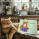 Um gato de mesa laranja com brinquedos e uma caneca de café roxa declarando que eles têm o gato mais perfeito que a mãe já teve! Feliz Dia de as mães do Gato