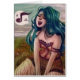Um produto com um design bonito, e colorido nele, que é uma mulher nova, verde-de cabelo que canta uma canção, em um prado.