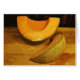 Este cartão de nota caracteriza uma fotografia das belas artes de duas fatias de melões alaranjados dourados do cantaloupe. São tão gostoso, o suco pode ser visto no conselho de corte de madeira. Os padrões da textura das cascas verdes e amarelas contra o ouro e o tom marrom aplainam mais a parede de madeira atrás criam uma composição abstrata interessante da cor e formam-na. A fotografia original foi aumentada digital para sublinhar ainda o humor total deste impressão impressionista, artístico da vida.