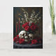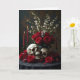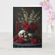Dois crânios com velas e um belo buquê de flores vermelhas e brancas, em um display memento mori, fazem um belo cartão de aniversário de Gótico.