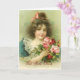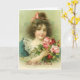 Design de aniversário do estilo vintage, engraçado, com um monograma com uma garotinha segurando o bouquet de rosa.