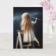 Uma menina loira, com um delicado vestido de renda, fica em uma escada de madeira pintando estrelas no céu noturno com uma escova de aniversário.