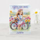 Um cartão de aniversário bonito, com fotografia de uma menina com seu ursinho de pelúcia e bicicleta, num dia ensolarado no campo com flores. O cartão exibe a saudação 'Parabéns' no topo e pode ser personalizado com o nome da criança abaixo da imagem.