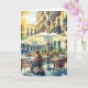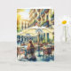 Este cartão apresenta uma jovem universitária ou universitária na escola. Um jovem estudante estuda no exterior. Trabalhando no laptop dela num café da rua num dia quente ensolarado.